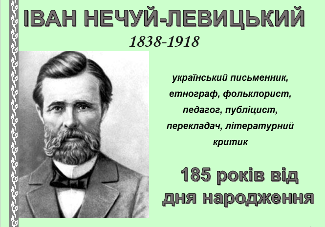 ІВАН НЕЧУЙ-ЛЕВИЦЬКИЙ – український письменник, етнограф, фольклорист, педагог, публіцист, перекладач, літературний критик, народився 25 листопада 1838 р. – 185 років від дня народження.