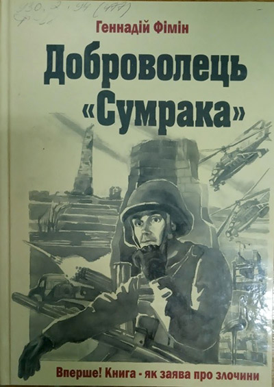 Фімін Г. Доброволець «Сумрака» [Текст]. Правда про війну / Геннадій Фімін. – Київ : СПД Фімін Г., 2016. – 64 с. Описано дивовижну долю автора, який пережив викрадення і полон терористів у червні 2014 року, коли на Донбасі вже відбувалися гарячі бої між українською армією та російськими військами. Це спогади про непростий і страшний час початку російської агресії в Україні. Геннадій Фімін потрапив в полон, зазнав катувань, відчув на собі роботу професійних російських ГРУшників… Ватажок терористів наказує розстріляти полоненого о десятій ранку наступного дня… А о восьмій ранку відбувається наступ кіровоградських спецпризначенців, і українські бійці його рятують. Він стає добровольцем і потрапляє на війну. В спогадах наведено лише факти, тут немає вигаданих подій та образів. Це не повість за реальним подіями. Це документ. Факти і події, описані в книзі, стали підставою для звернення до правоохоронних органів із заявою про скоєння злочинів. |