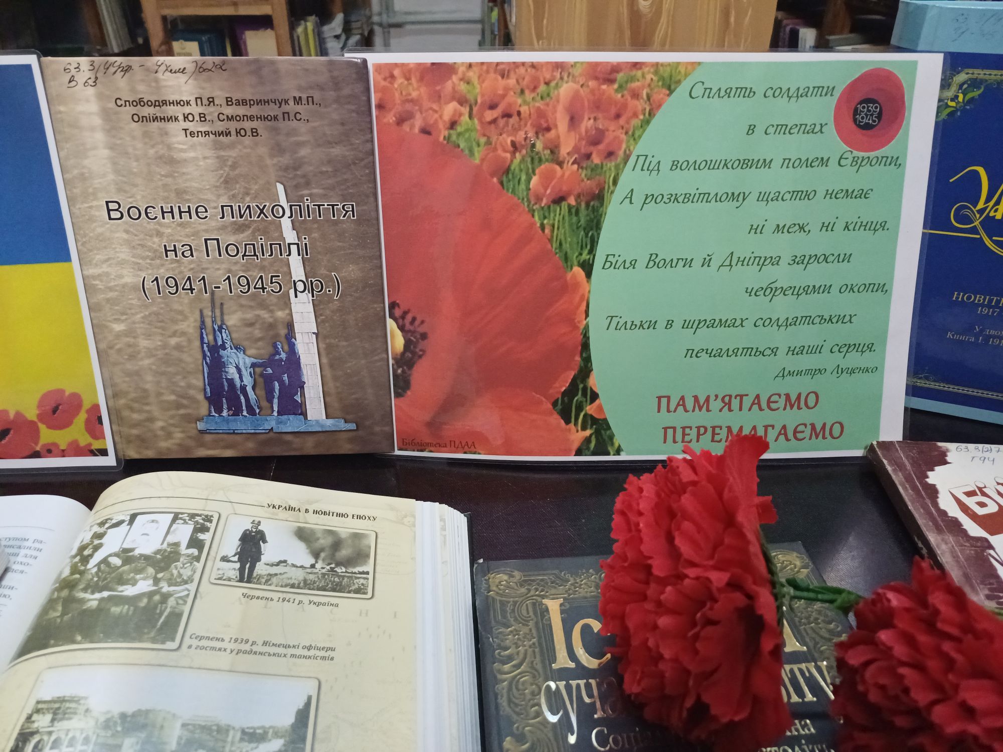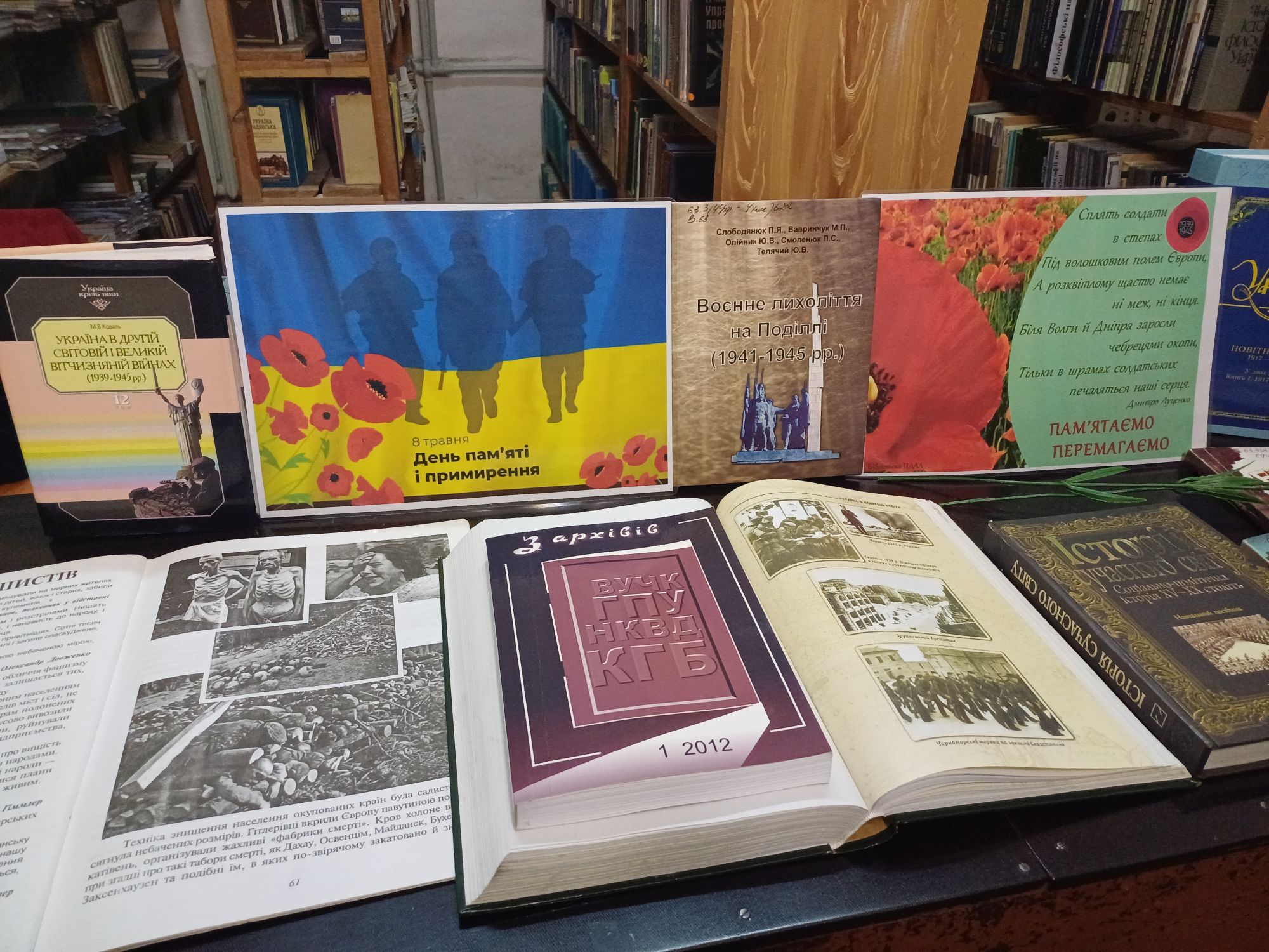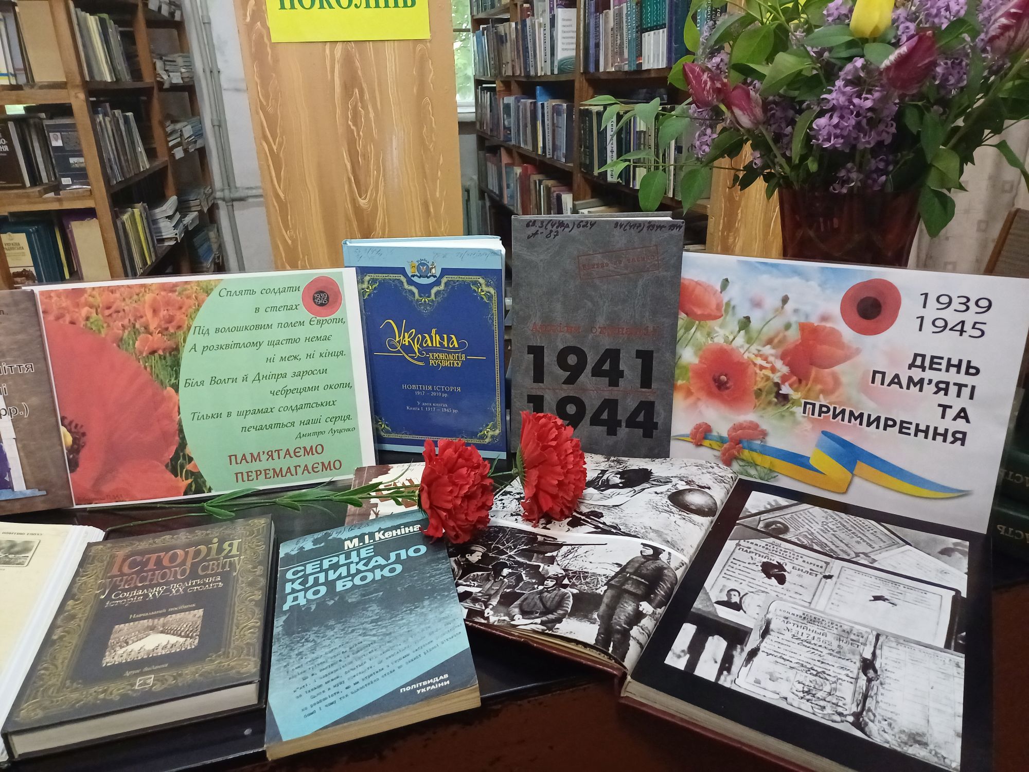 Наукова бібліотека запрошує відвідати книжкову тематичну виставку до Дня пам’яті та примирення «1939-1945. Пам’ятаємо. Перемагаємо», яка експонується в секторі навчальної літератури. На виставці представлені видання, які висвітлюють причини, перебіг, історичне значення та наслідки Другої Світової війни, місце і роль України в цій жахливій війні, спогади учасників бойових дій та їх внесок у перемогу над нацизмом.