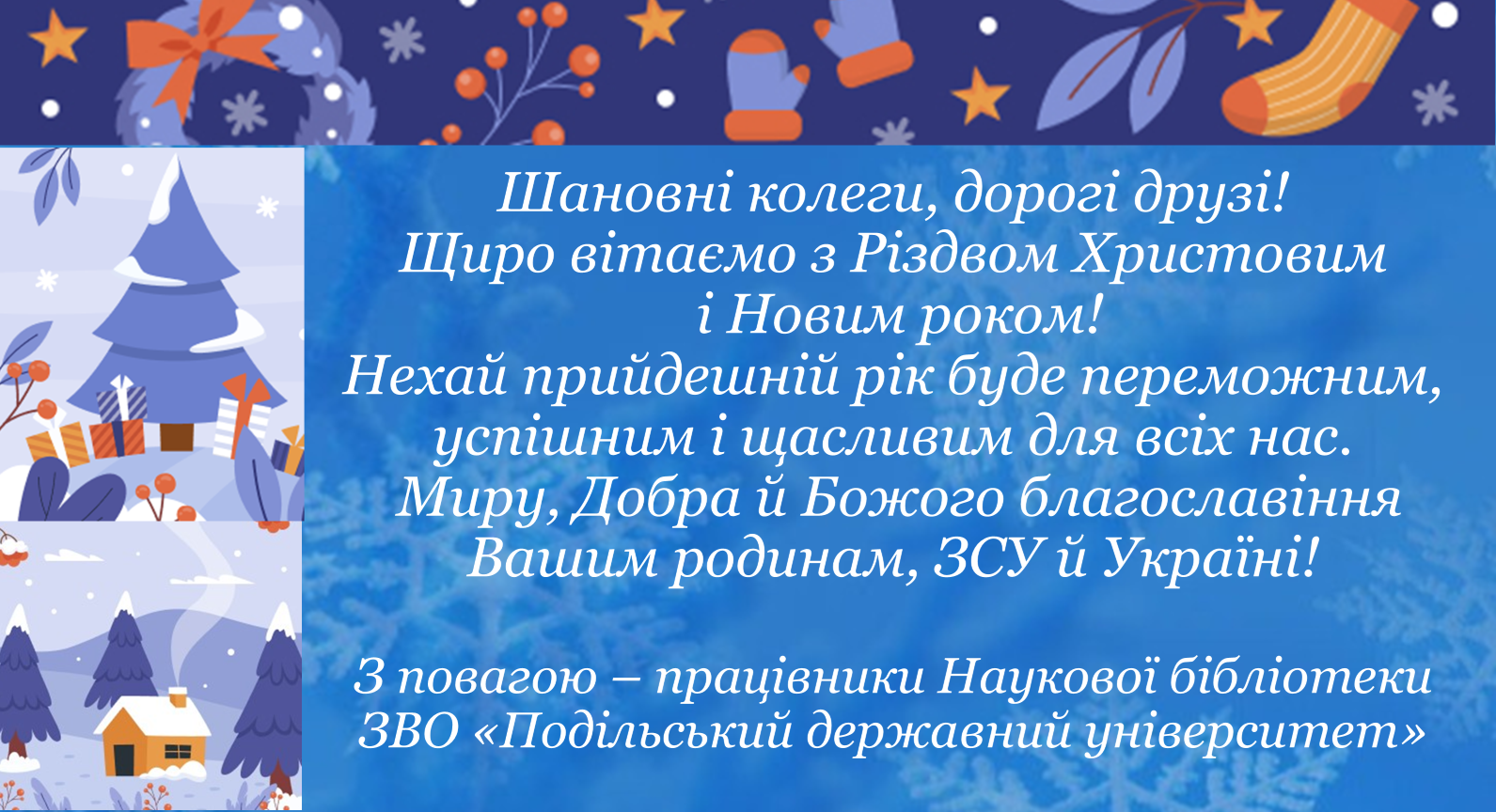 Шановні науково-педагогічні працівники і здобувачі вищої освіти Закладу вищої освіти «Подільський державний університет» працівники Наукової бібліотеки щиро вітають вас з Різдвом Христовим і Новим роком! Бажаємо здоров’я і добра, Миру та злагоди, успіхів і радісних подій у Новому 2025 році!