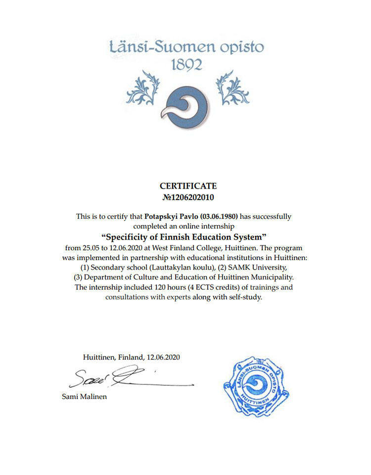 Так, 12 червня 2020 року завершилося наукове онлайн стажування співробітників навчально-наукового інституту енергетики ПДАТУ: доцента Дубіка В.М., доцента Потапського П.В. асистента Думанського О.В., яке організовано Західно-Фінляндським коледжем та Польсько-українською фундацією "Інститут Міжнародної Академічної і Наукової Співпраці" (IIASC). Тематика стажування – "Особливості фінської системи освіти". Програма реалізується за підтримки мерії м. Гуйтіннен (Фінляндія) у партнерстві із місцевими закладами освіти. Метою наукового стажування було опанування проектного підходу в організації навчального процесу у закладах освіти Фінляндії та підвищення рівня кваліфікації фахівців на основі кращих міжнародних практик та інновацій. Проведення стажування відбулося із використання онлайн платформи ZOOM.US. Програма передбачала 120 год (4 кредити ECTS) лекційних занять та самостійної роботи. Учасники стажування по завершенню отримали відповідні сертифікати.