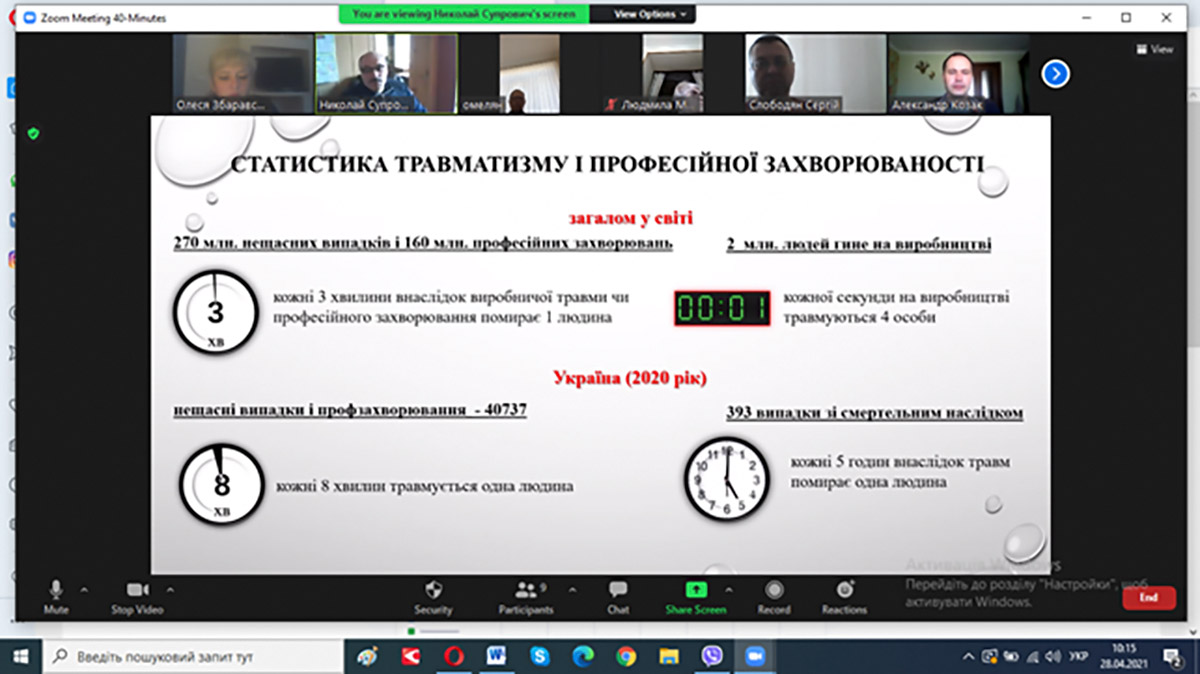 У цей день більш ніж в 100 країнах світу проводяться заходи, спрямовані на привернення уваги громадськості до невирішених проблем охорони праці. Не залишився осторонь і наш університет: в навчально-науковому інституті енергетики, з ініціативи кафедри фізики, охорони праці та інженерії середовища проведено онлайн-семінар «Всесвітній день охорони праці 2021р.» Пандемія COVID-19 обумовила вибір теми Всесвітнього дня охорони праці цього року. У 2020 році вірус загальмував життя цілої планети і внаслідок цього, постраждали як роботодавці, так і працівники. Наслідки негативного впливу коронавірусної інфекції на сферу праці доводиться долати до цього часу. Разом з кризою прийшло усвідомлення важливості зміцнення систем безпеки та здоров'я на роботі, включно зі службами безпеки та охорони здоров'я, про що у своїй доповіді розповів кандидат технічних наук, доцент СУПРОВИЧ МИКОЛА ПЕТРОВИЧ. Питання, які пов'язані з виплатою матеріального забезпечення (надання допомоги) застрахованим особам у зв'язку з настанням страхового випадку (тимчасової втрати працездатності) розповів страховий експерт з охорони праці Вижницького відділення управління виконавчої дирекції Фонду соціального страхування України в Чернівецькій області СЕМИРОЗУМ ОМЕЛЯН ІВАНОВИЧ. Про стратегії зміцнення систем безпеки та здоров'я на роботі, спрямованим на посилення життєстійкості та протидії нинішнім і майбутнім кризам з урахуванням винесених уроків і набутого досвіду в сфері праці розповів керівник сільськогосподарської дорадчої служби «Агроаргумент» БЕРЕЗЮК ОЛЕКСАНДР ГРИГОРОВИЧ.