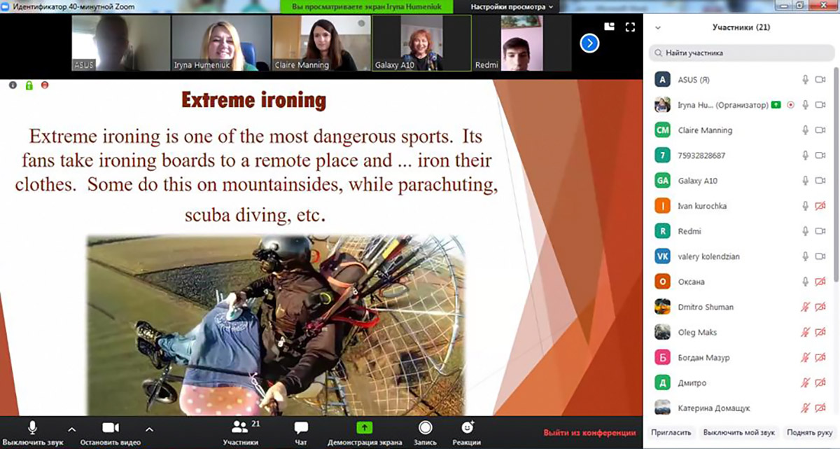 Кафедра іноземних мов організувала та провела 13 травня засідання англомовного дискусійного клубу Подільського державного аграрно-технічного університету у звичному уже онлайн форматі на платформі Zoom. Цього разу до засідання доєдналася 21 особа, в числі НПП кафедри іноземних мов, студентів та слухачі курсів ПДАТУ, особливим гостем була Клер Елізабет Меннінг – волонтер Корпусу Миру США. Тема дискусії: «Незвичні хобі» виявилась надзвичайно цікавою та подекуди провокативною. Присутні залюбки дискутували та задавали свої питання. Засідання видалось жвавим та динамічним.