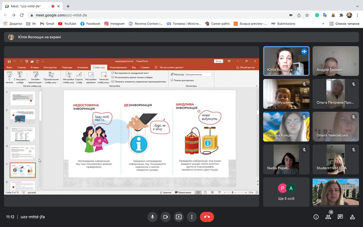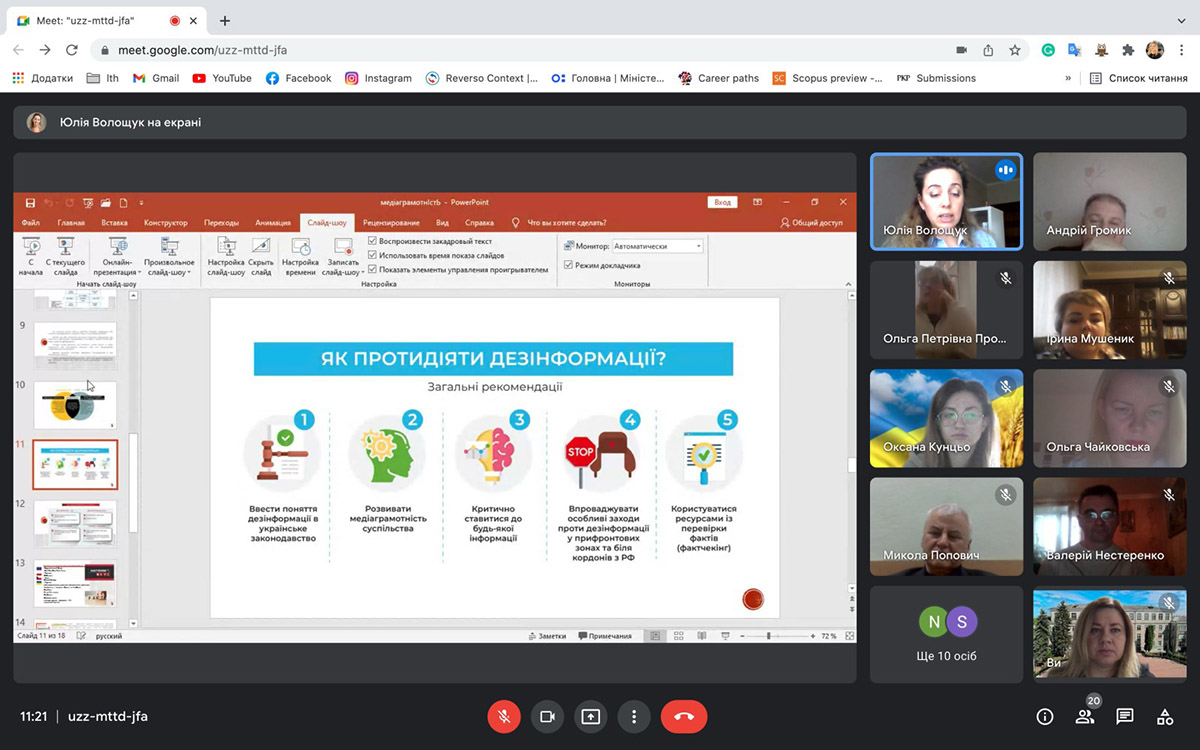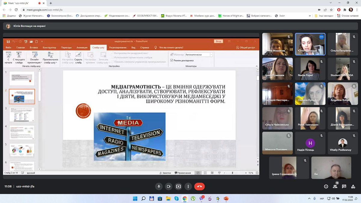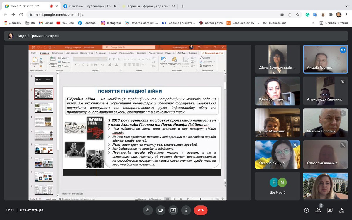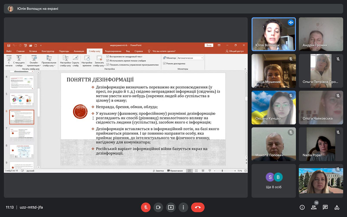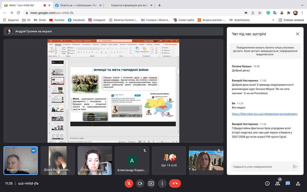 Тож, 17 лютого 2022 року колективом навчально-наукового інституту заочної і дистанційної освіти було проведено зустріч-бесіду з питань медіаграмотності та проблем протидії гібридним загрозам та інформаційно-пропагандистському впливу. Активну участь у онлайн-заході взяли співробітники кафедр іноземних мов, математики, інформатики та академічного письма, права, професійної та соціально-гуманітарної освіти.