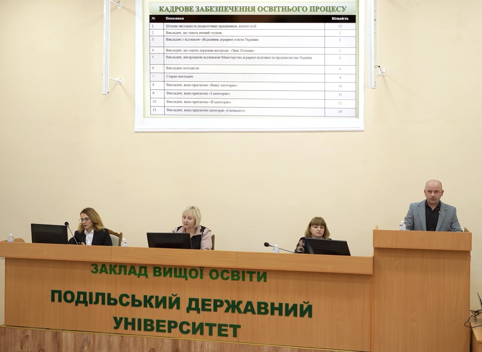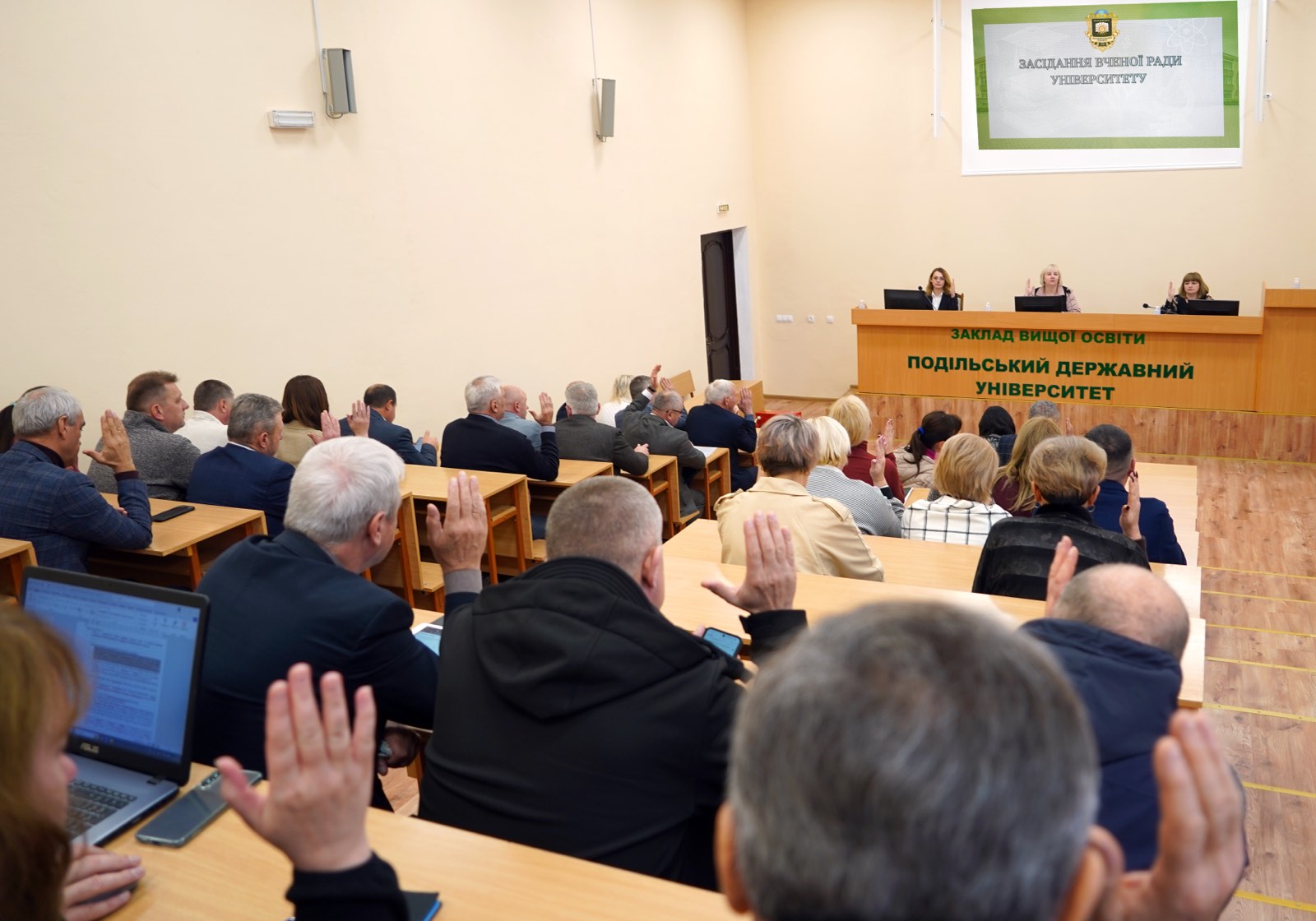 На засіданні Вченої ради розглянуто й прийнято рішення про: призначення наукових керівників здобувачам третього (освітньо-наукового) рівня вищої освіти ступеня доктора філософії 2025 року вступу денної форми навчання (за кошти державного бюджету) та затвердження індивідуального плану наукової роботи докторанта; затвердження рекомендацій про направлення на міжнародне науково-педагогічне стажування за премією Івана Виговського та індивідуального плану роботи стажування на 2025-2026 н. р. доцента КУЧЕРА Олега Володимировича; затвердження звіту про проходження закордонного стажування ТКАЧ Лілії Вікторівни; рекомендації до видання навчального посібника «Фактори агротехнологій в рослинництві» авторів професора ГОРАША Олександра Савича та доцента КЛИМИШЕНОЇ Ріти Іванівни; опублікування електронного збірника матеріалу І Міжнародної науково-практичної інтернет-конференції «Сучасні технології та технічний сервіс: виклики та перспективи»; питання складу Ради молодих учених Закладу вищої освіти «Подільський державний університет».