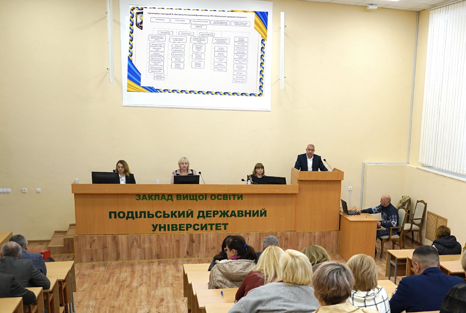 31 жовтня 2025 року відбулося планове засідання Вченої ради Закладу вищої освіти «Подільський державний університет». Голова Вченої ради Закладу вищої освіти «Подільський державний університет», професор Алла ІВАНОВСЬКА привітала з ювілеєм доктора педагогічних наук, кандидата технічних наук, заслуженого працівника освіти, завідувача кафедри, професора ДУГАНЦЯ Віктора Івановича.