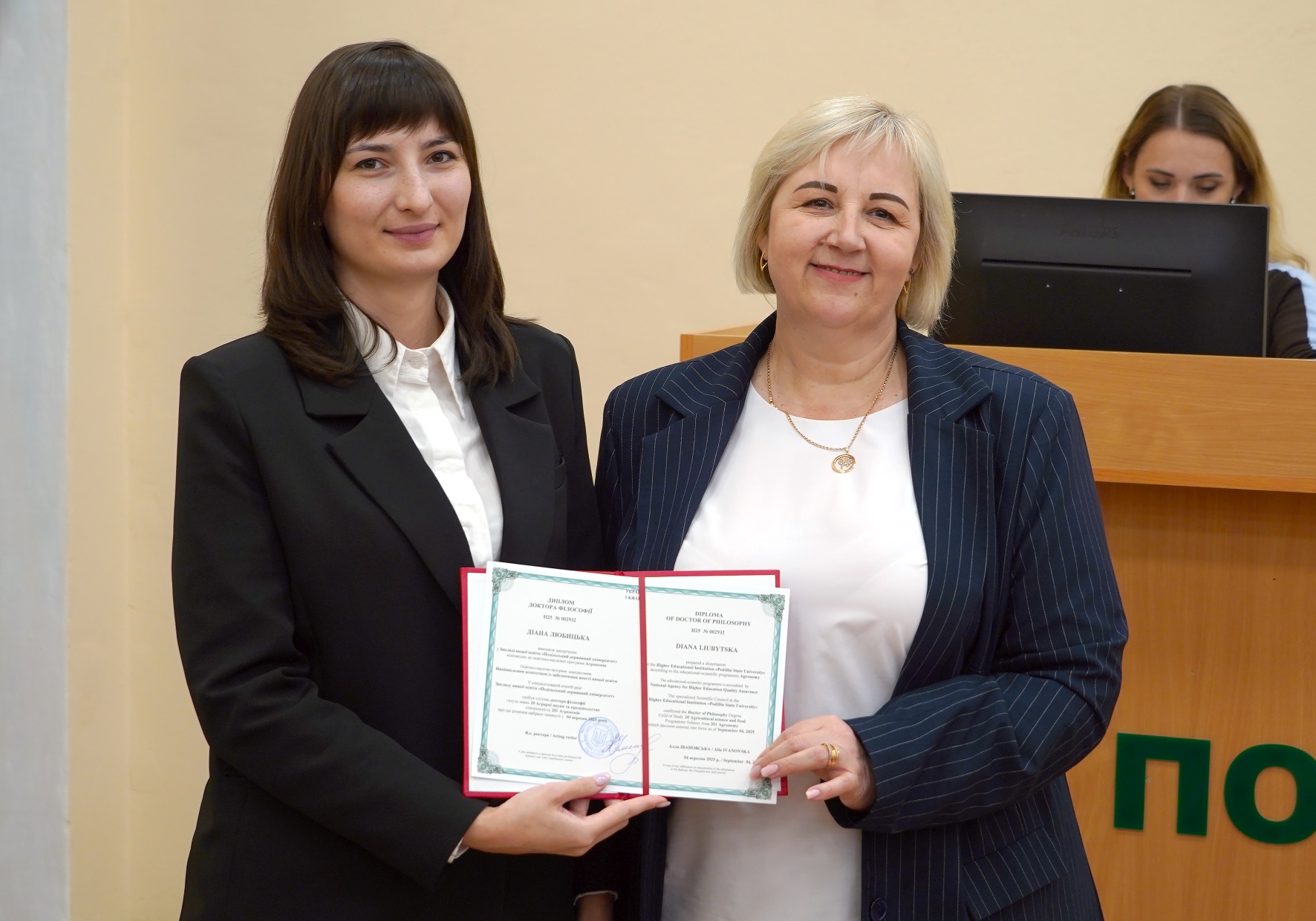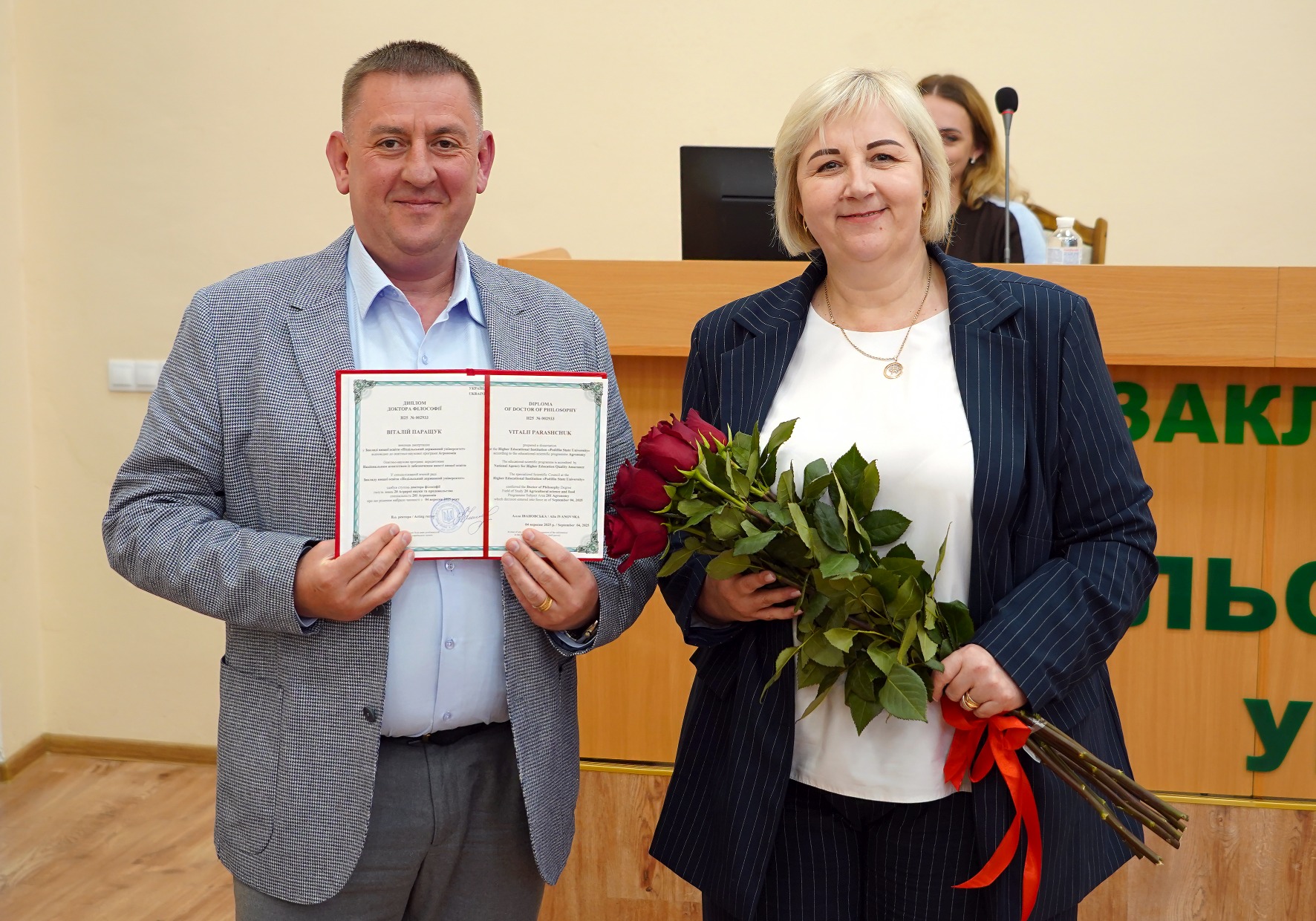 25 вересня 2025 року відбулося планове засідання Вченої ради Закладу вищої освіти «Подільський державний університет. Засідання розпочалось із урочистостей – голова Вченої ради Закладу вищої освіти «Подільський державний університет», професор Алла ІВАНОВСЬКА вручила дипломи доктора філософії зі спеціальності 201 «Агрономія» Діані ЛЮБИЦЬКІЙ та Віталію ПАРАЩУКУ.