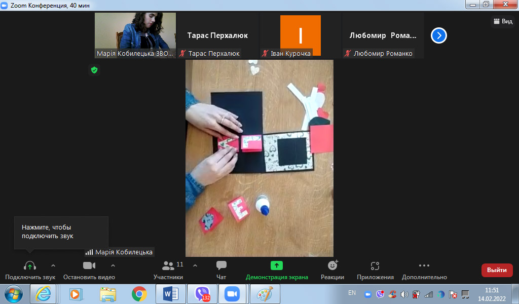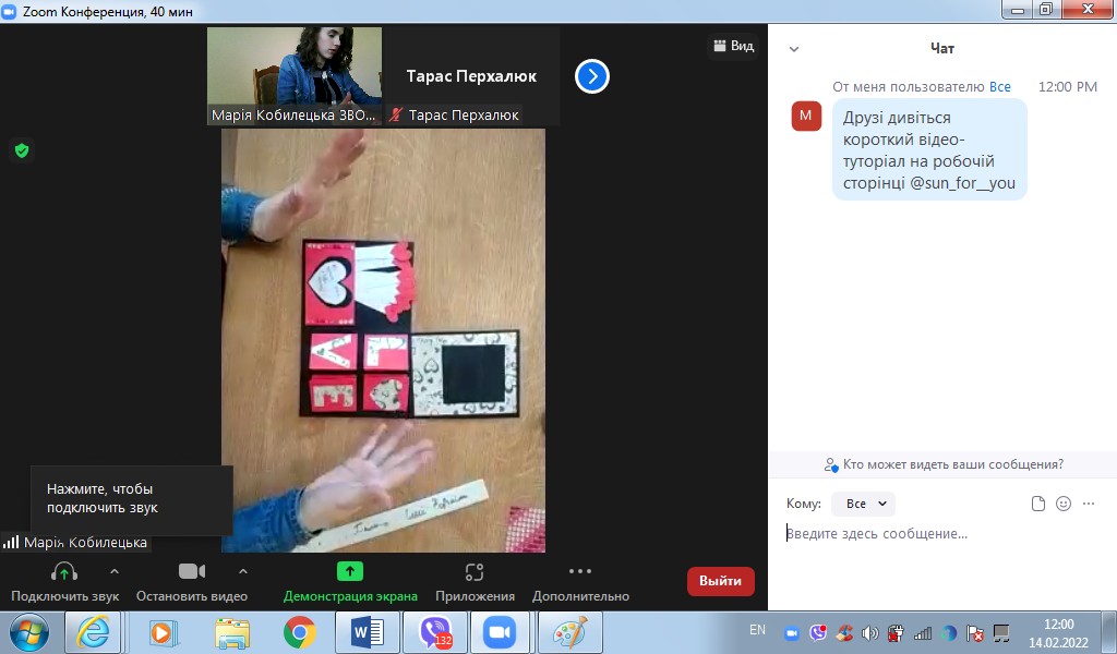 У День святого Валентина, 14 лютого, під час спеціального онлайн майстер-класу на платформі ZOOM, у студентів нашого закладу була унікальна можливість зробити листівку власними руками. Наша майстриня, здобувачка Навчально-наукового інституту енергетики Подільського державного університету Леся ЧОРПІТА продемонструвала створення креативного сувеніру для близьких і дорогих серцю людей.