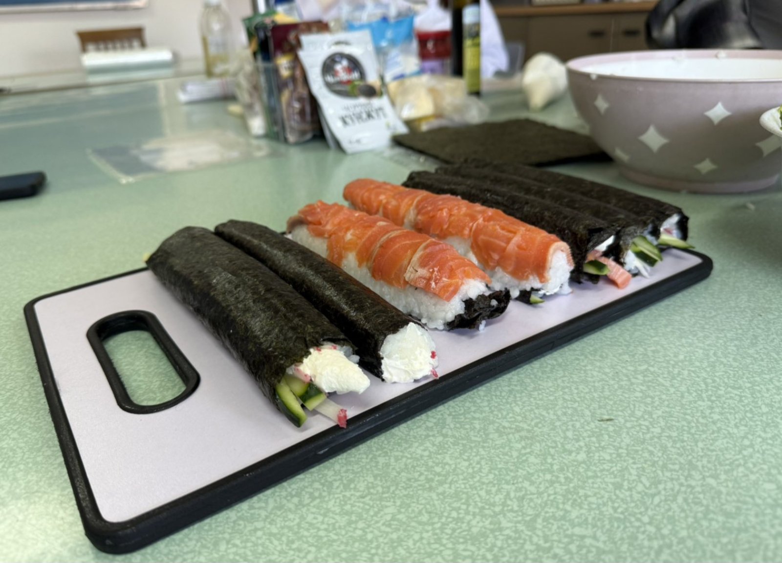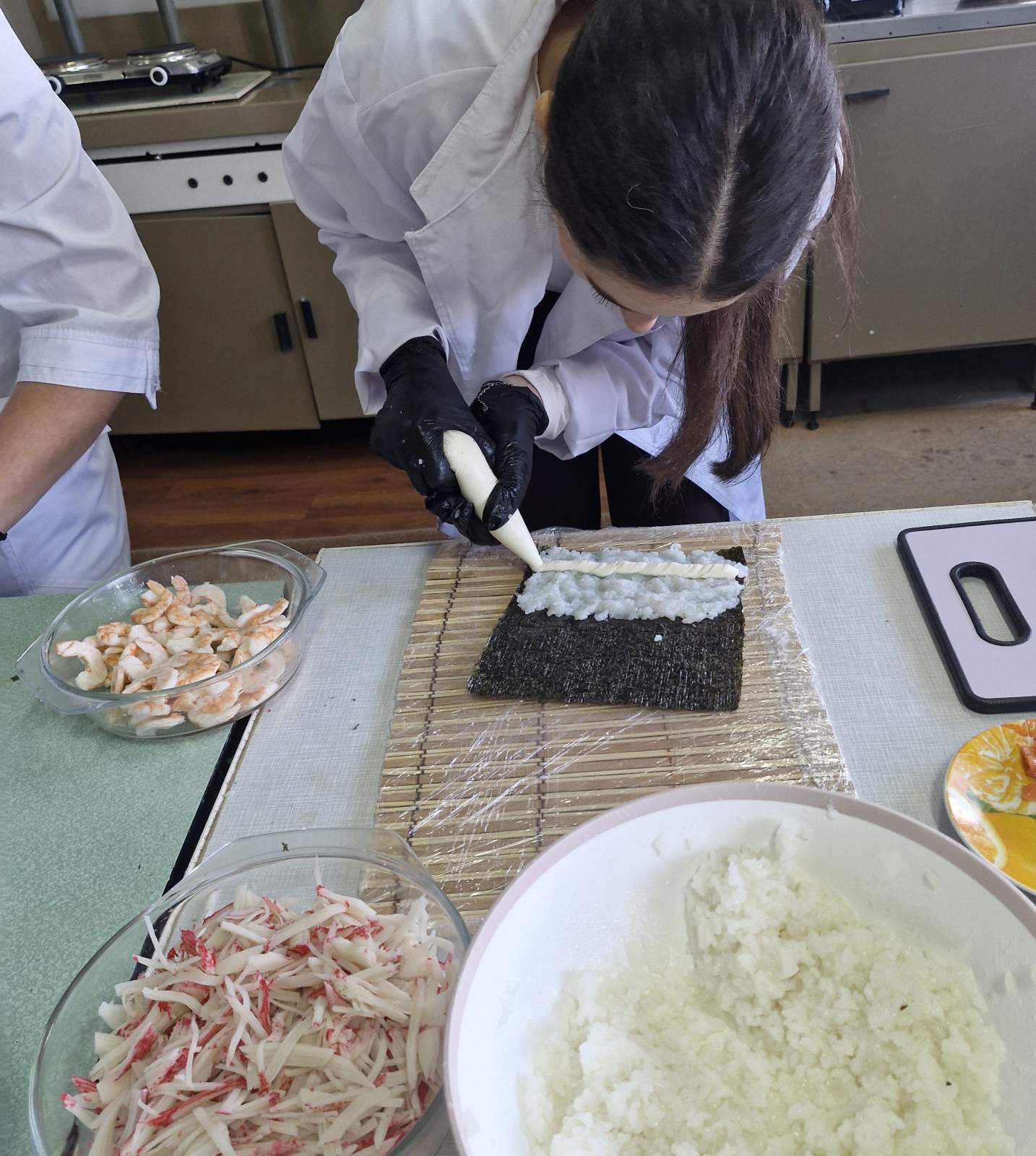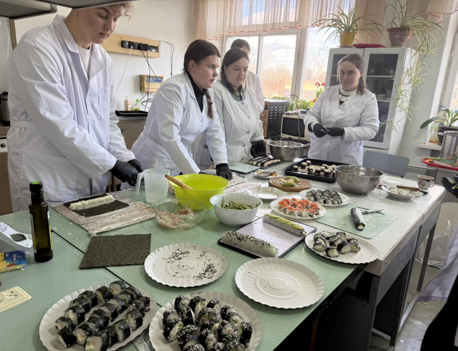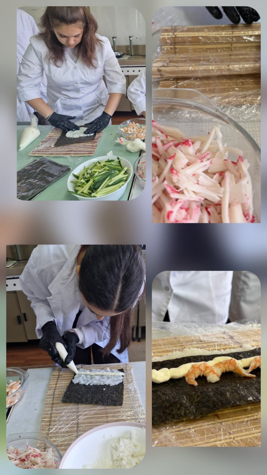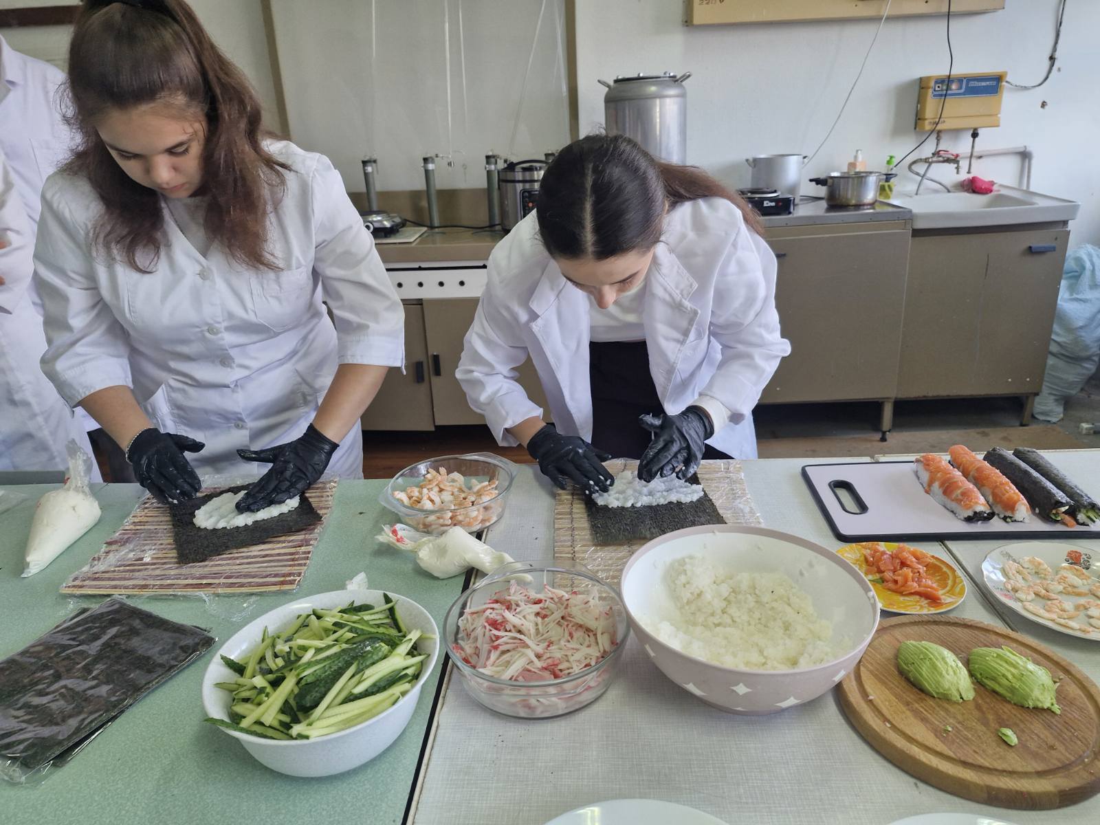 Заняття, на яких здобувачі власноруч практикують відпрацювання різних технологічних прийомів, як от приготування суші, стають не лише захопливою формою занять, а й реальним практичним досвідом. Передусім молодь дізналася про історію походження суші, види ролів, способи і техніку нарізання риби, овочів, правила поєднання смаків та правильне оформлення страви. Такі майстер-класи розвивають уважність, акуратність і відчуття гармонії — як у смаку, так і в подачі. Суші — це традиційна страва японської кухні, що набула широкої популярності у всьому світі. Основними інгредієнтами є: відварений рис, приправлений оцтовою заправкою; риба, морепродукти; овочі, водорості норі, тощо. Технологічний процес приготування суші передбачає послідовність операцій, які забезпечують отримання безпечного, естетично привабливого та органолептично збалансованого продукту.