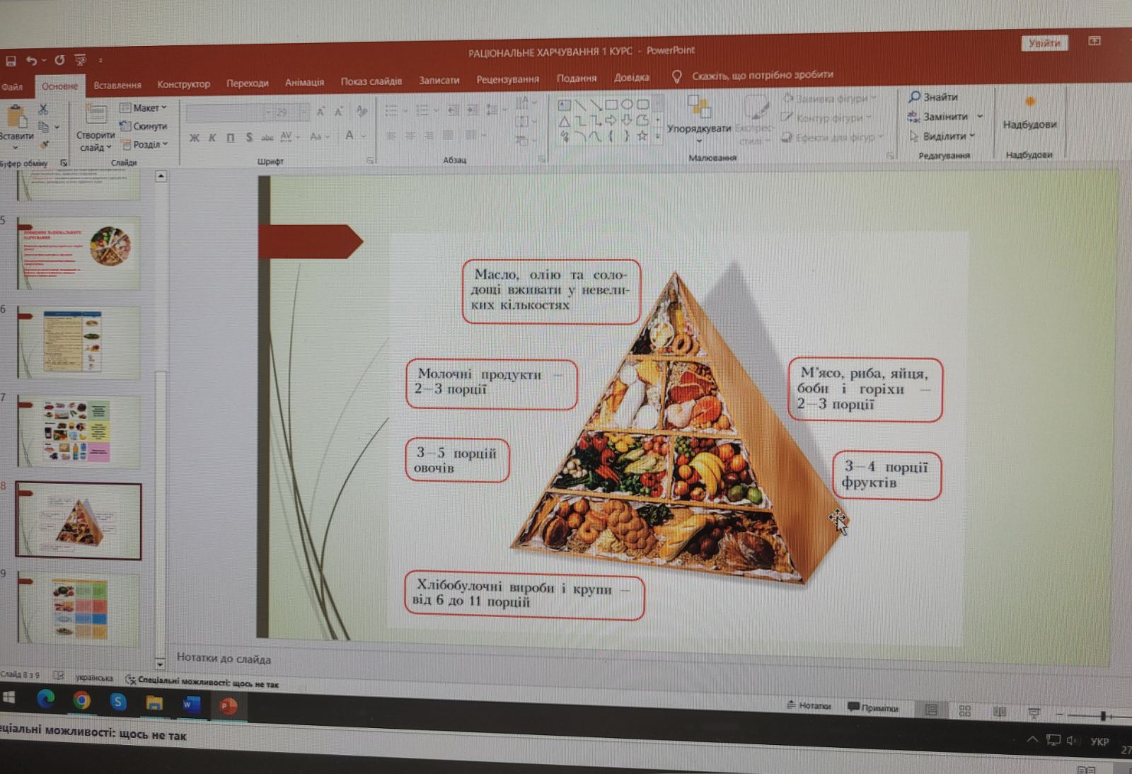 Викладач розказала про оптимальне співвідношення життєво необхідних поживних речовин у продуктах харчування - білків, жирів та вуглеводів, які необхідні для здоров’я нашого організму; основні категорії людей, які потребують різних енергетичних потреб та раціонів; важливість відповідності харчового раціону енергетичним потребам організму; дотримання правильного режиму харчування впродовж дня.