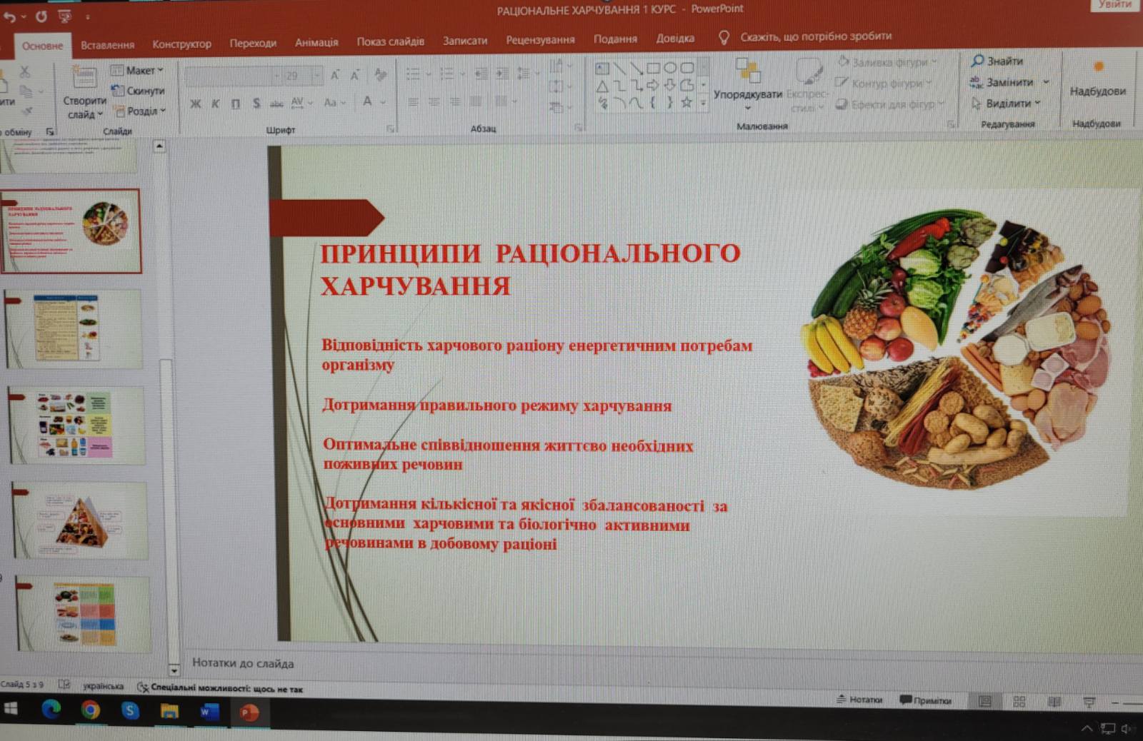 Куратор розповіла про нутриціологію як науку про їжу та харчування, про склад продуктів харчування, основні поживні речовини та інші компоненти, що містяться в цих продуктах, про їхню взаємодію, про режими споживання, засвоєння, використання організмом та виведення з організму. Здобувачі ознайомились із основними принципами раціонального харчування, видами альтернативного харчування, профілактичного та лікувально-профілактичного.