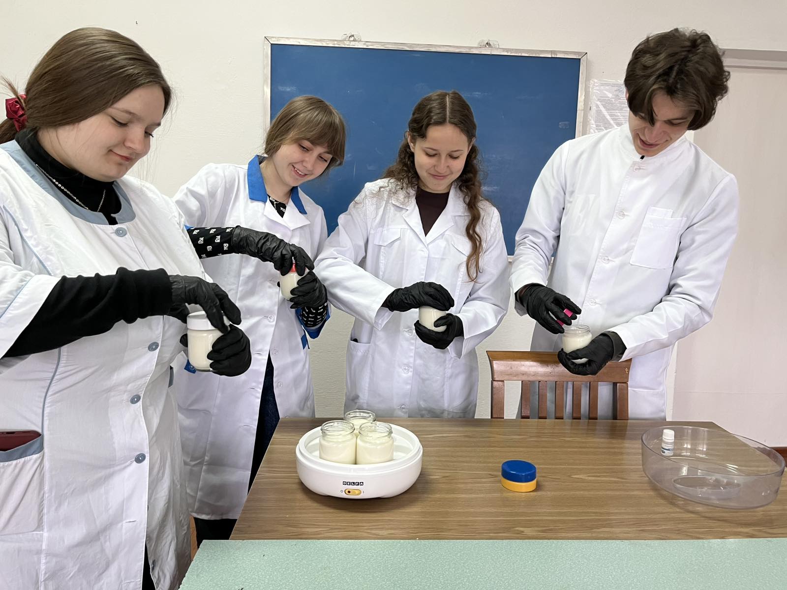 Молоко є природною еконішею для молочнокислих бактерій. Наразі, не слід забувати, що воно не завжди здатне забезпечити ефективний розвиток заквашувальної мікрофлори, що може визначатися як природними чинниками, такі технологічними. Прикладами природних чинників є: сезонні зміни складу молока, які стають найвідчутнішими у весняному молоці. Саме тому засідання наукового студентського гуртка «ХАРЧОВИК» здобувачів спеціальності G13 «ХАРЧОВІ ТЕХНОЛОГІЇ» було присвячено вивченню складу і властивостей заквасок нового покоління. Здобувачі, опрацювавши значну кількість літературних джерел і лекційний матеріал з дисципліни «Мікробіологія харчових продуктів» підготовили доповіді з вказаної теми. Першочергово визначали якісні показники молочної сировини на сучасному приладі – аналізаторі молока. Наступним етапом було внесення закваски у молоко для виготовлення йогурту. Органолептичні дослідження готового продукту проводили по закінченню технологічного процесу.