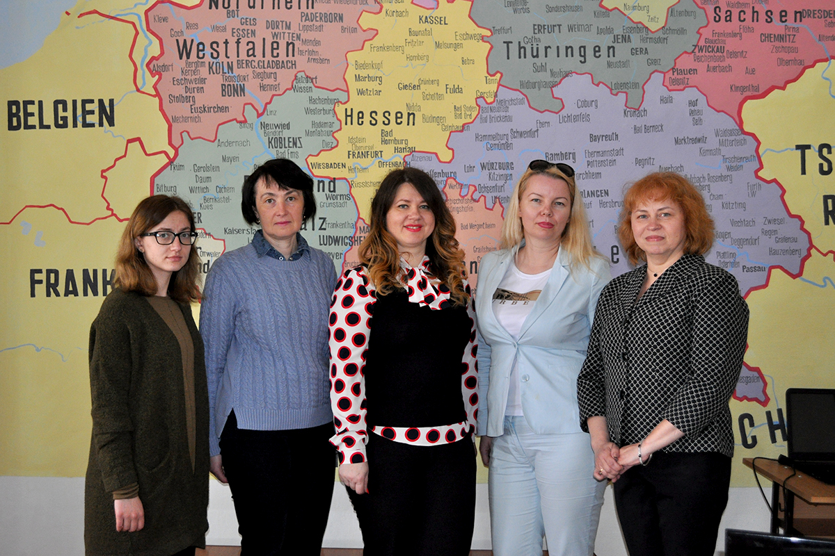 | Колектив кафедри Кунцьо О.І., викладач німецької та латинської мов, Попель Н.А., викладач французької та англійської мов, Гуменюк І.І., канд.філол.наук, завідувач кафедри іноземних мов, Чайковська О.В., канд.філол.наук, викладач англійської мови. |